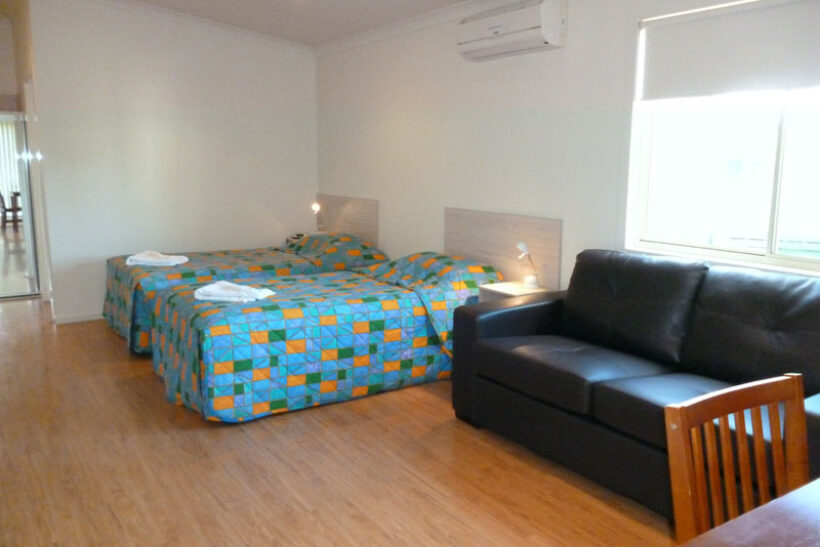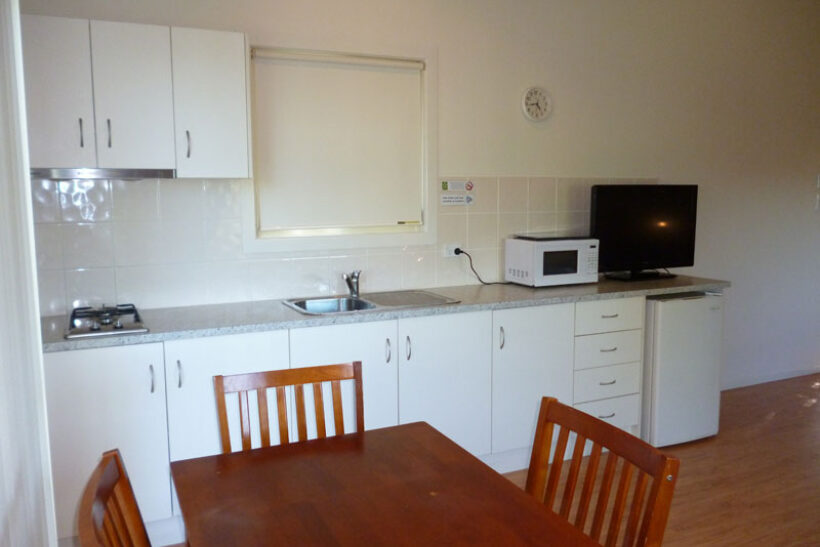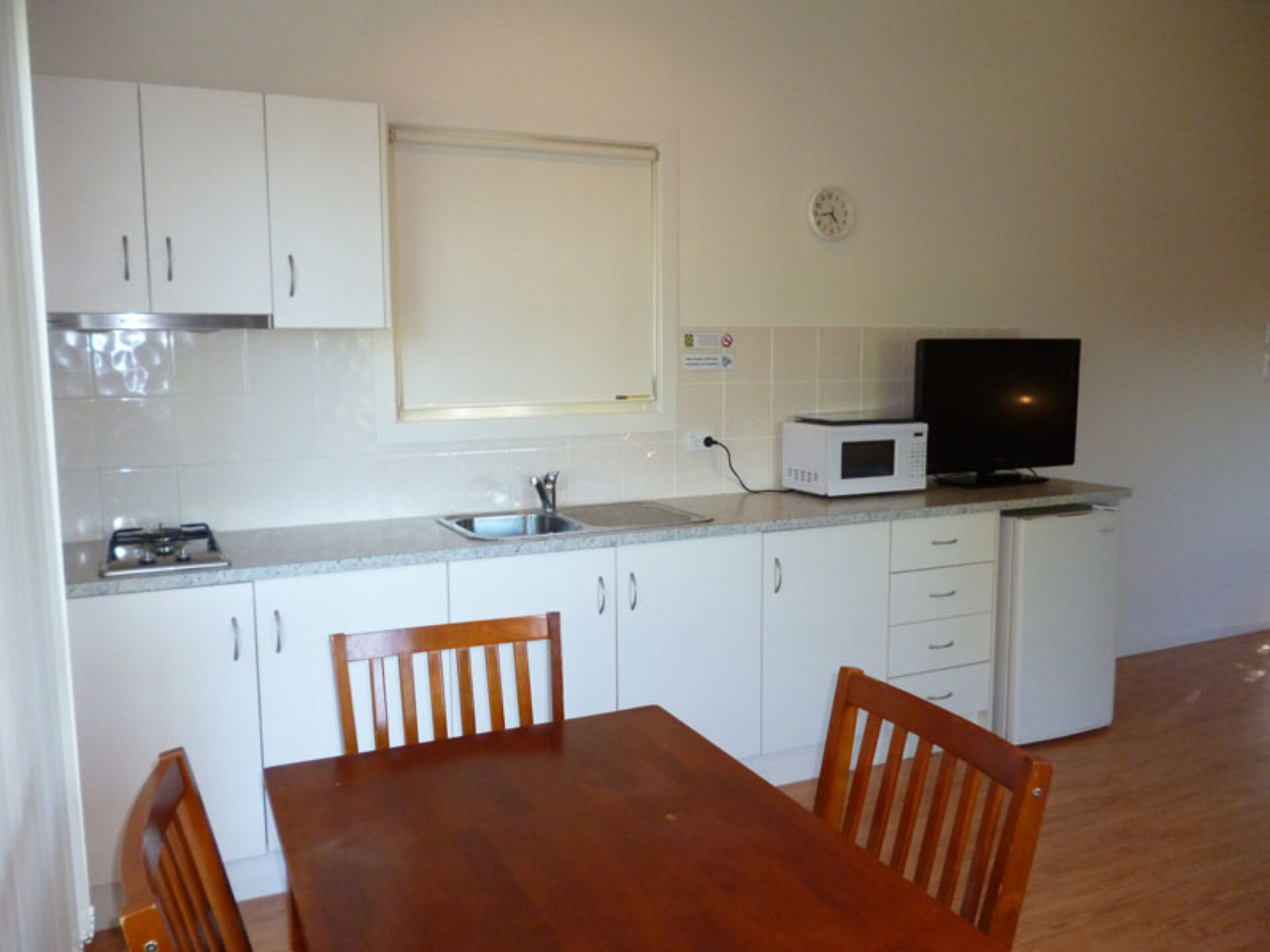 Designed with accessibility in mind, this pet-friendly studio sleeps up to three with a queen bed and a single bed. It features a private bathroom with accessible fittings, a full kitchen with electric cooktop, microwave, and full-size fridge, and a dining area with TV. Reverse cycle air conditioning ensures a comfortable stay year-round.