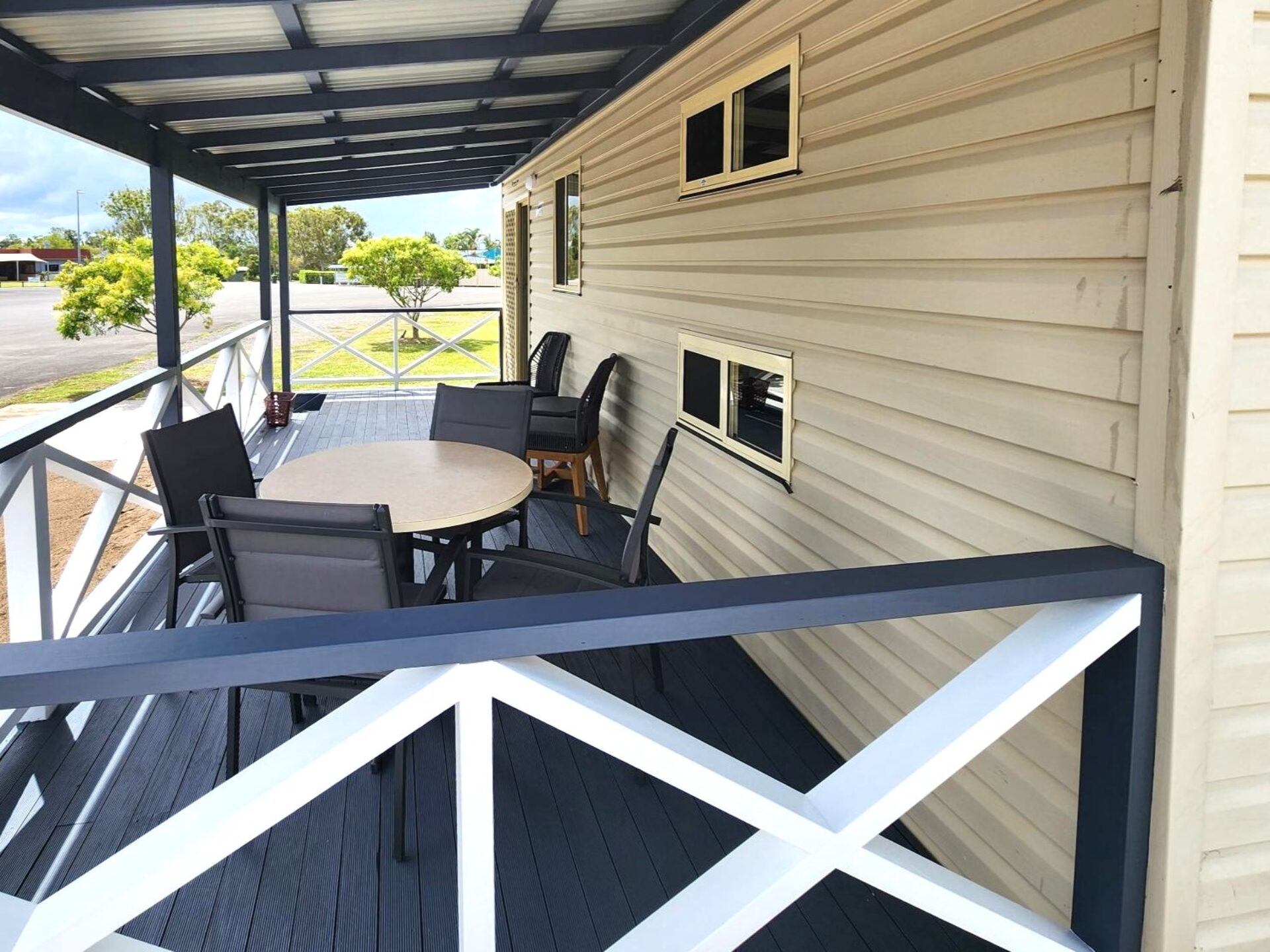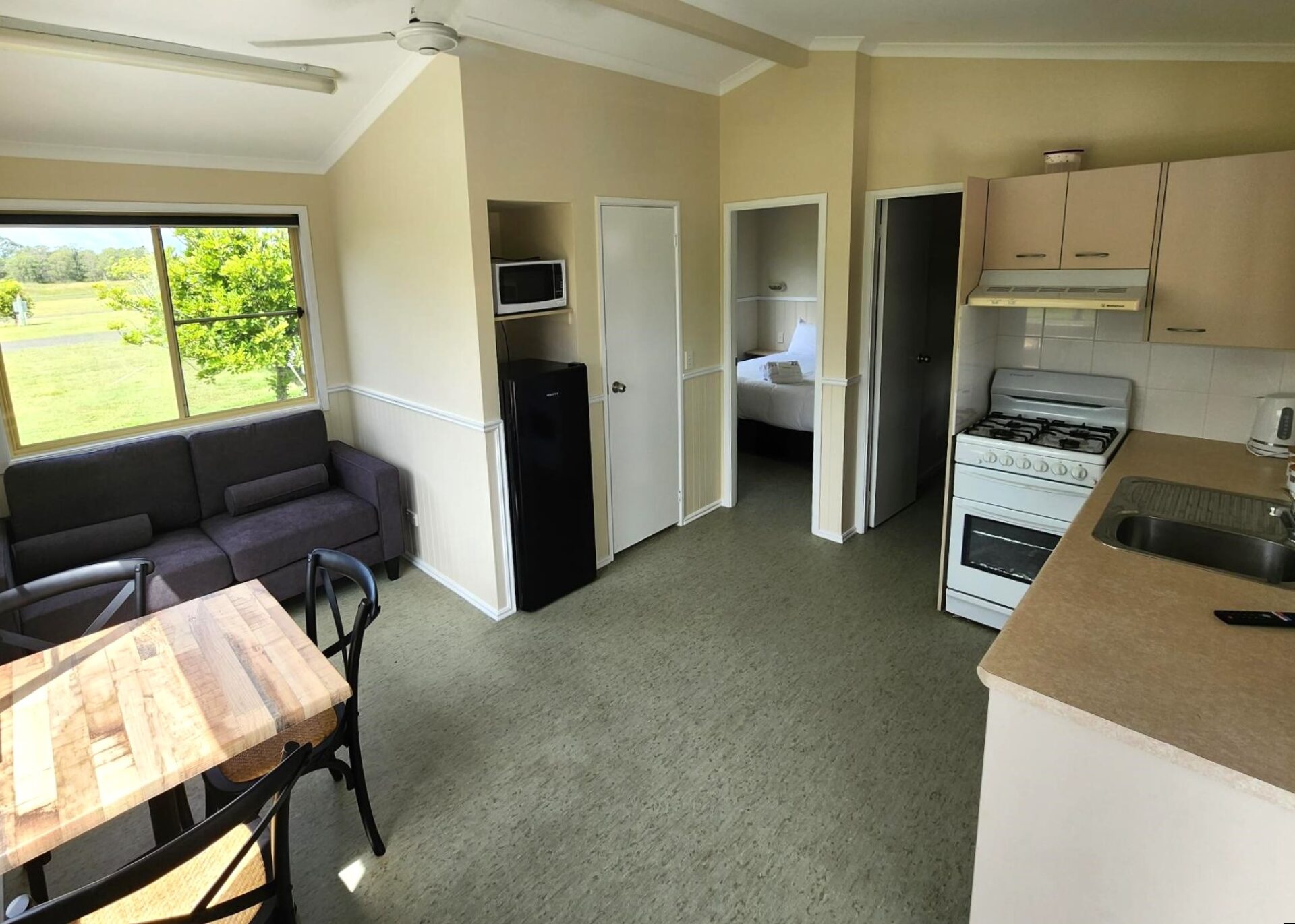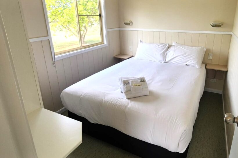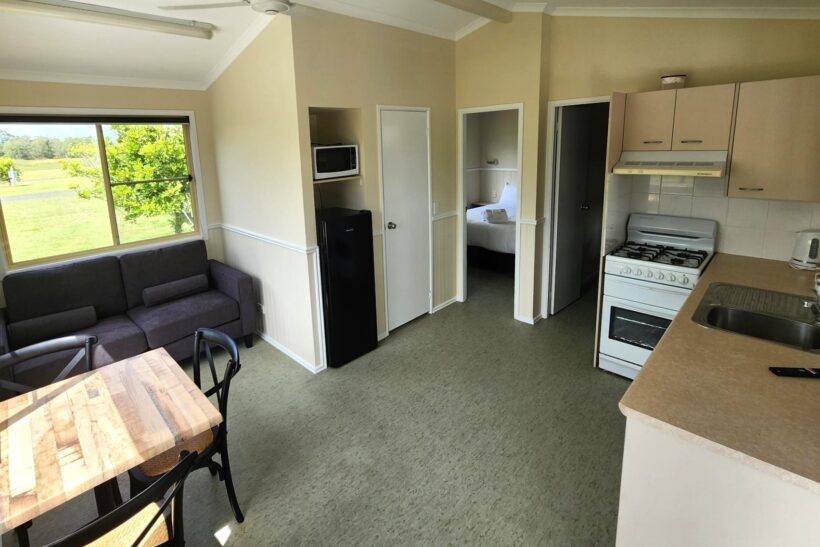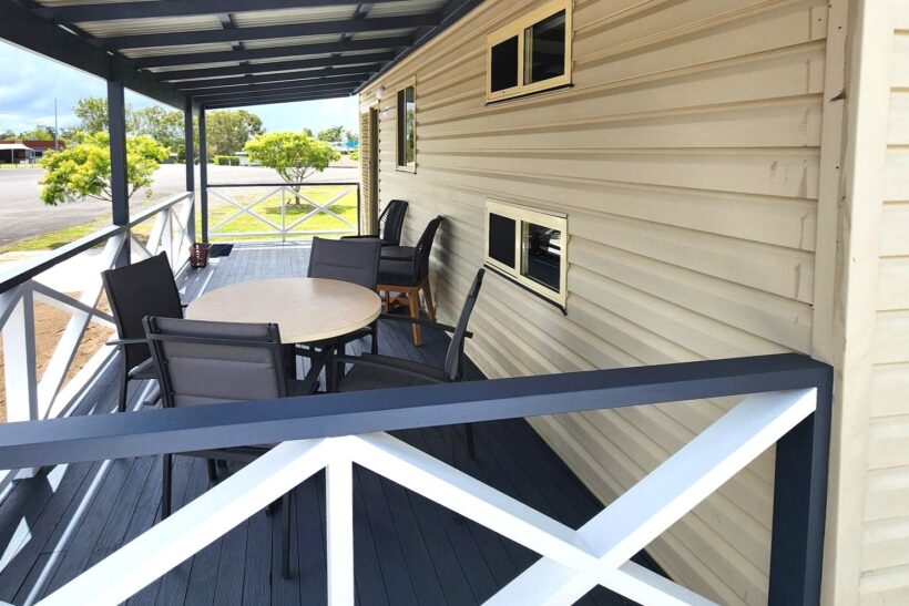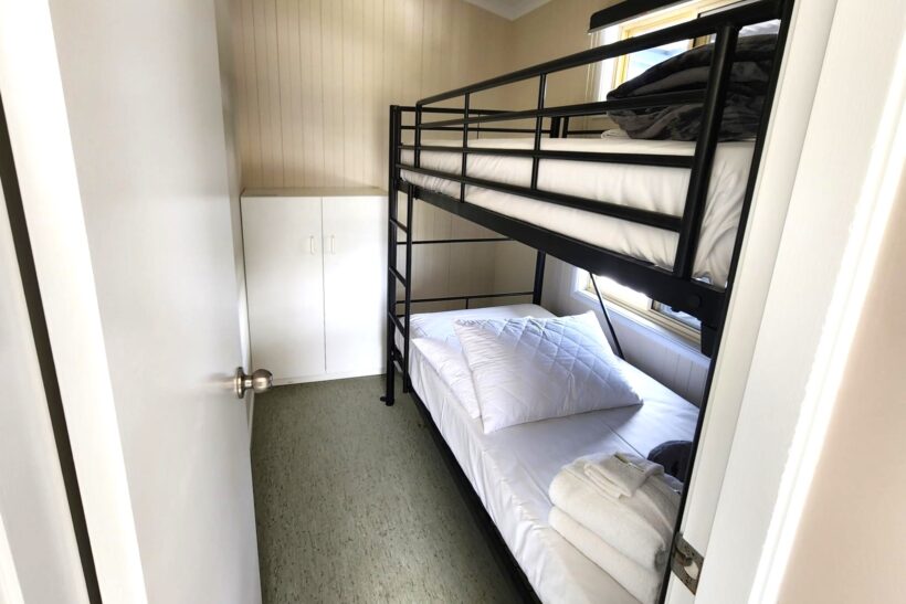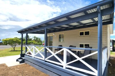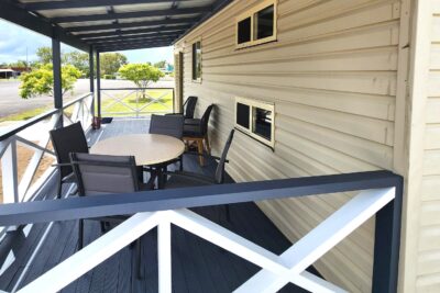 This two-bedroom cabin sleeps up to four with a queen bed and two single beds. It features a well-equipped kitchen with gas oven, stovetop, microwave, and bar fridge. Enjoy dining and relaxing in the open-plan living space with TV and air conditioning, or step out onto the spacious undercover balcony for a peaceful retreat.
