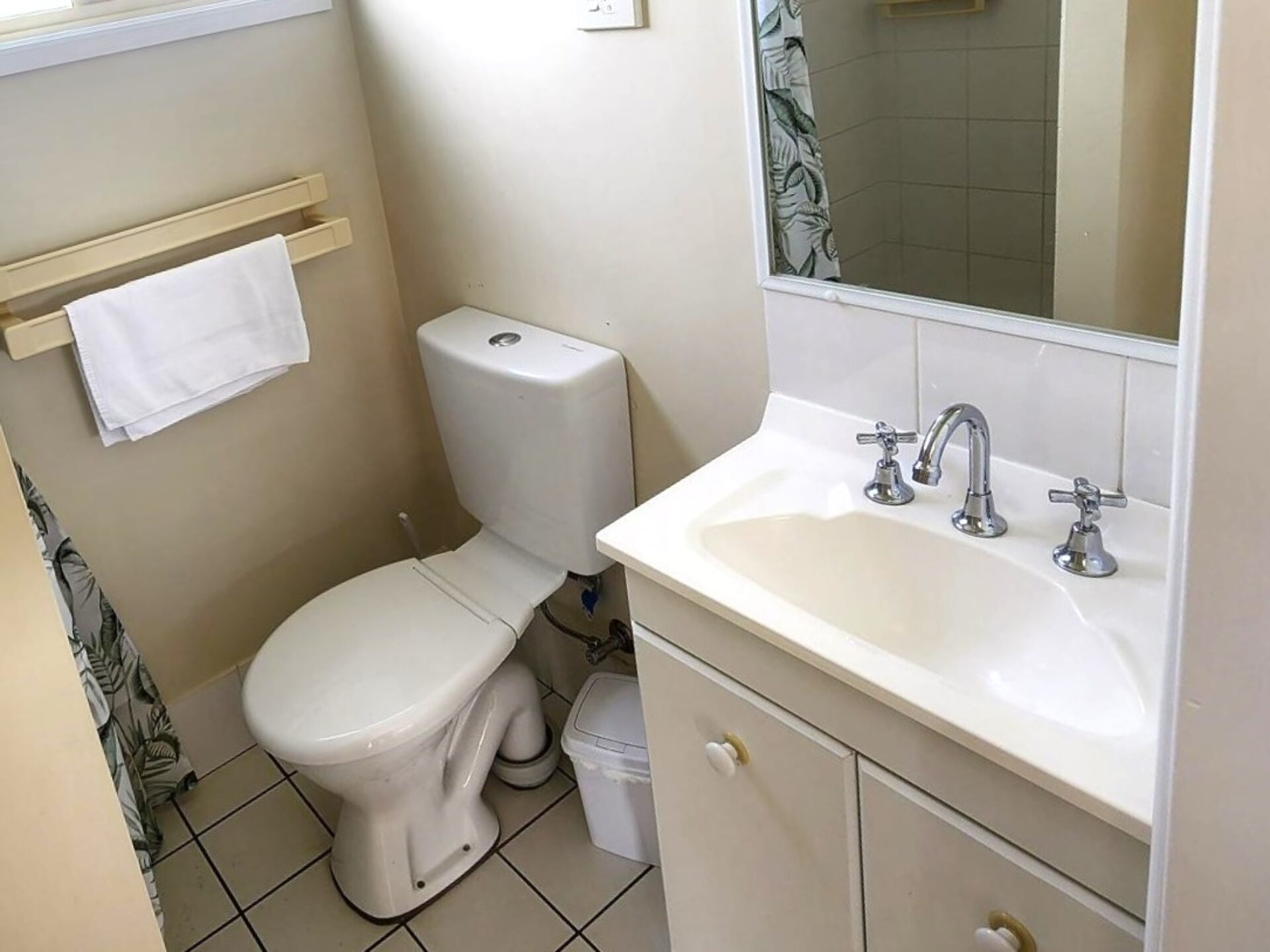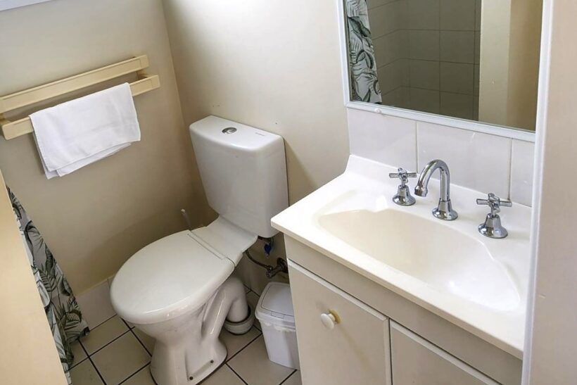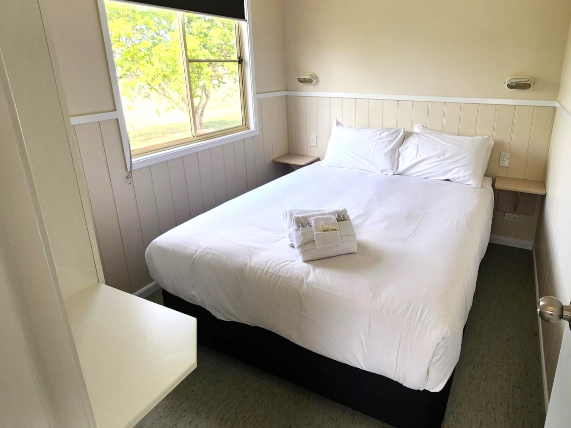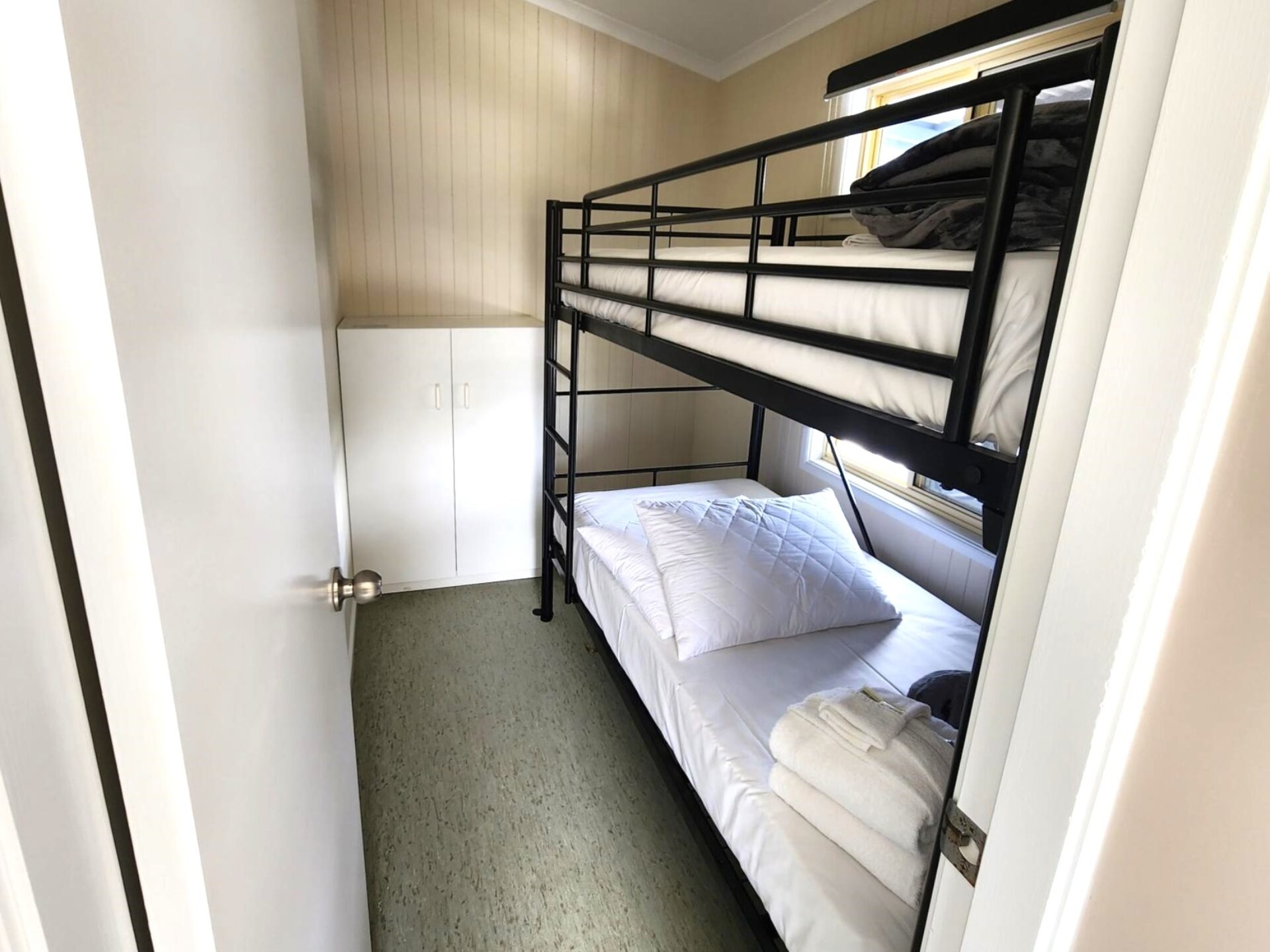 This two-bedroom cabin sleeps up to four with a queen bed and two single beds. It features a well-equipped kitchen with gas oven, stovetop, microwave, and bar fridge. Enjoy dining and relaxing in the open-plan living space with TV and air conditioning, or step out onto the spacious undercover balcony for a peaceful retreat.