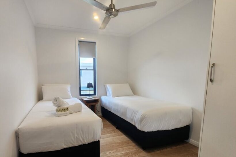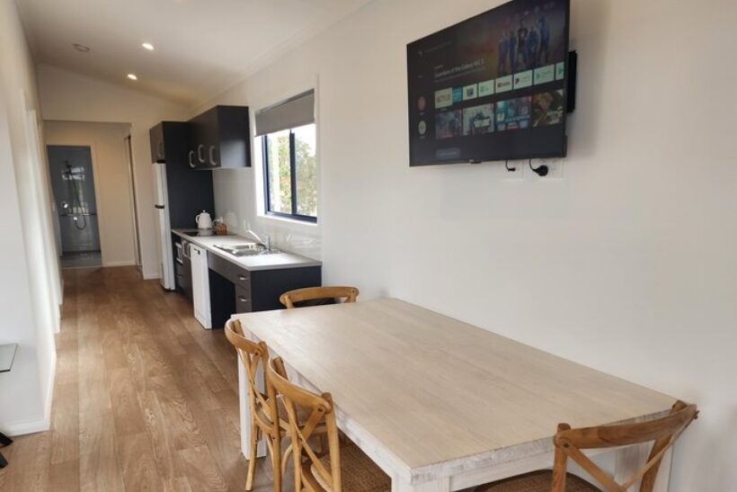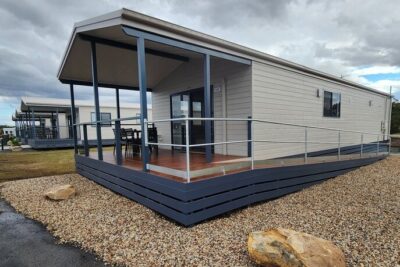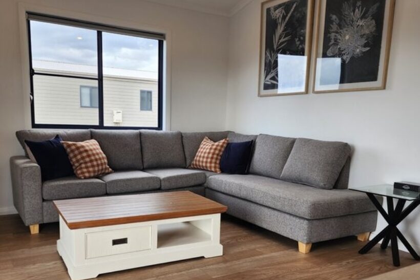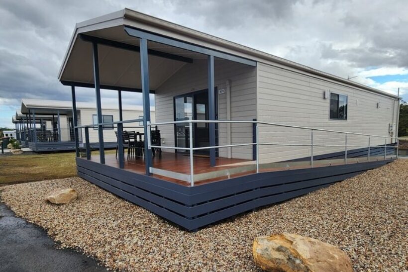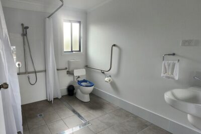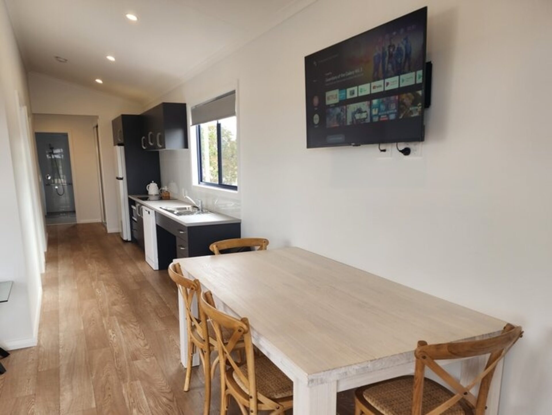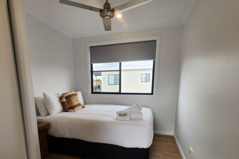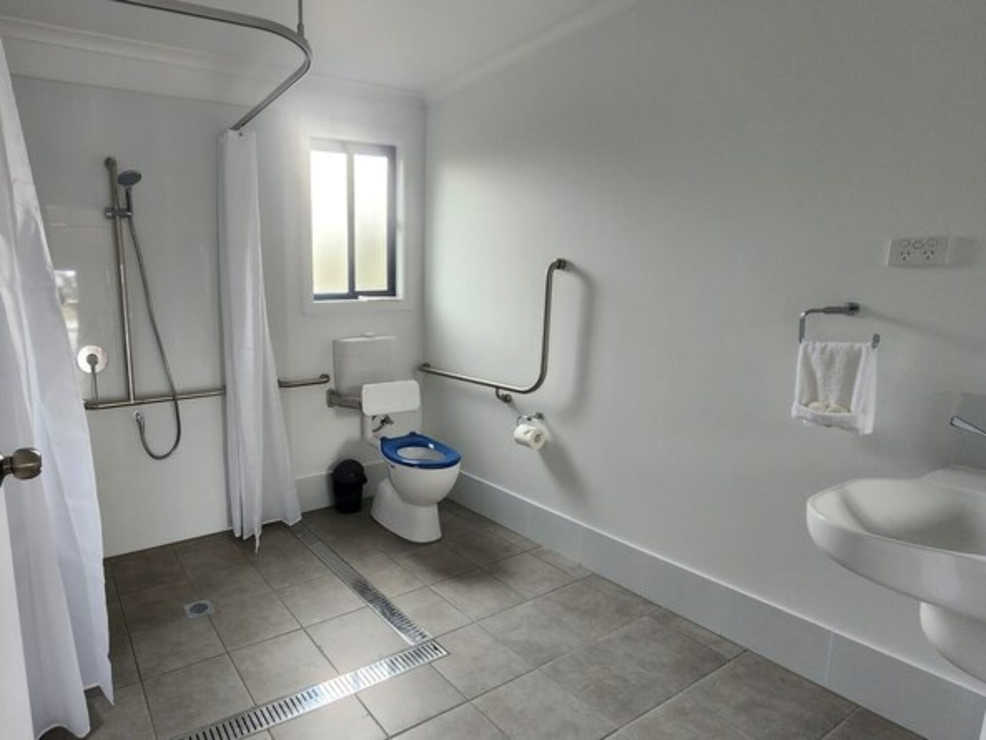 Designed for comfort and accessibility, this three-bedroom cabin sleeps up to six with two queen beds and two single beds. It features a private bathroom with accessible amenities, full kitchen with electric cooktop, microwave, dishwasher, and full-size fridge. Enjoy reverse cycle air conditioning and a spacious outdoor deck with dining set.